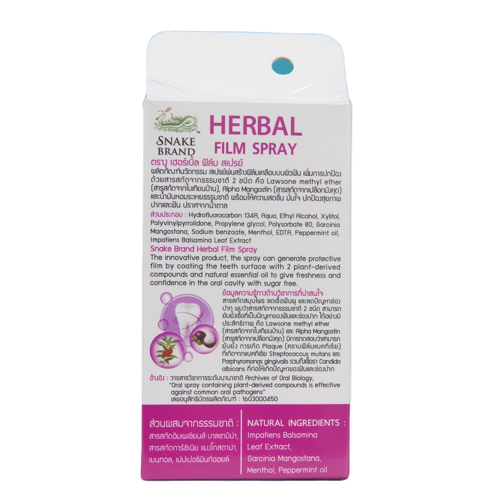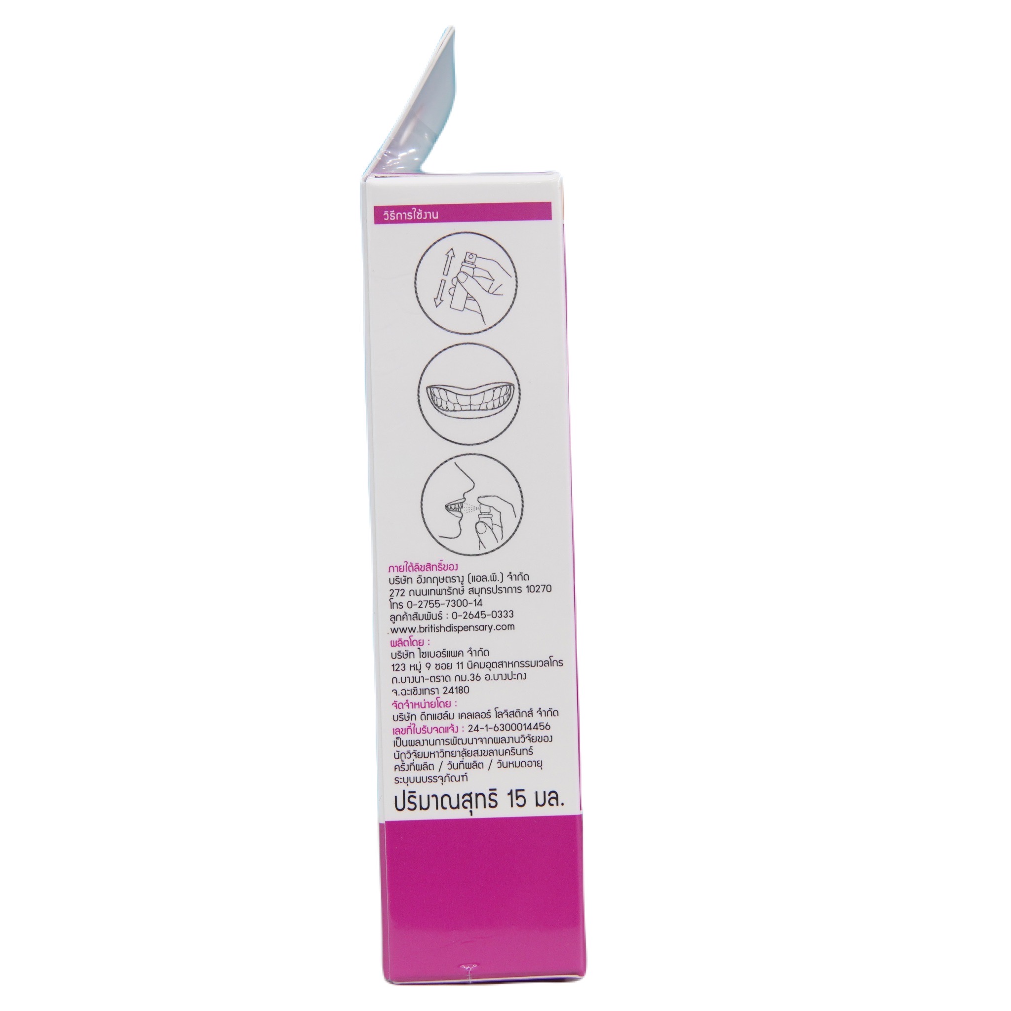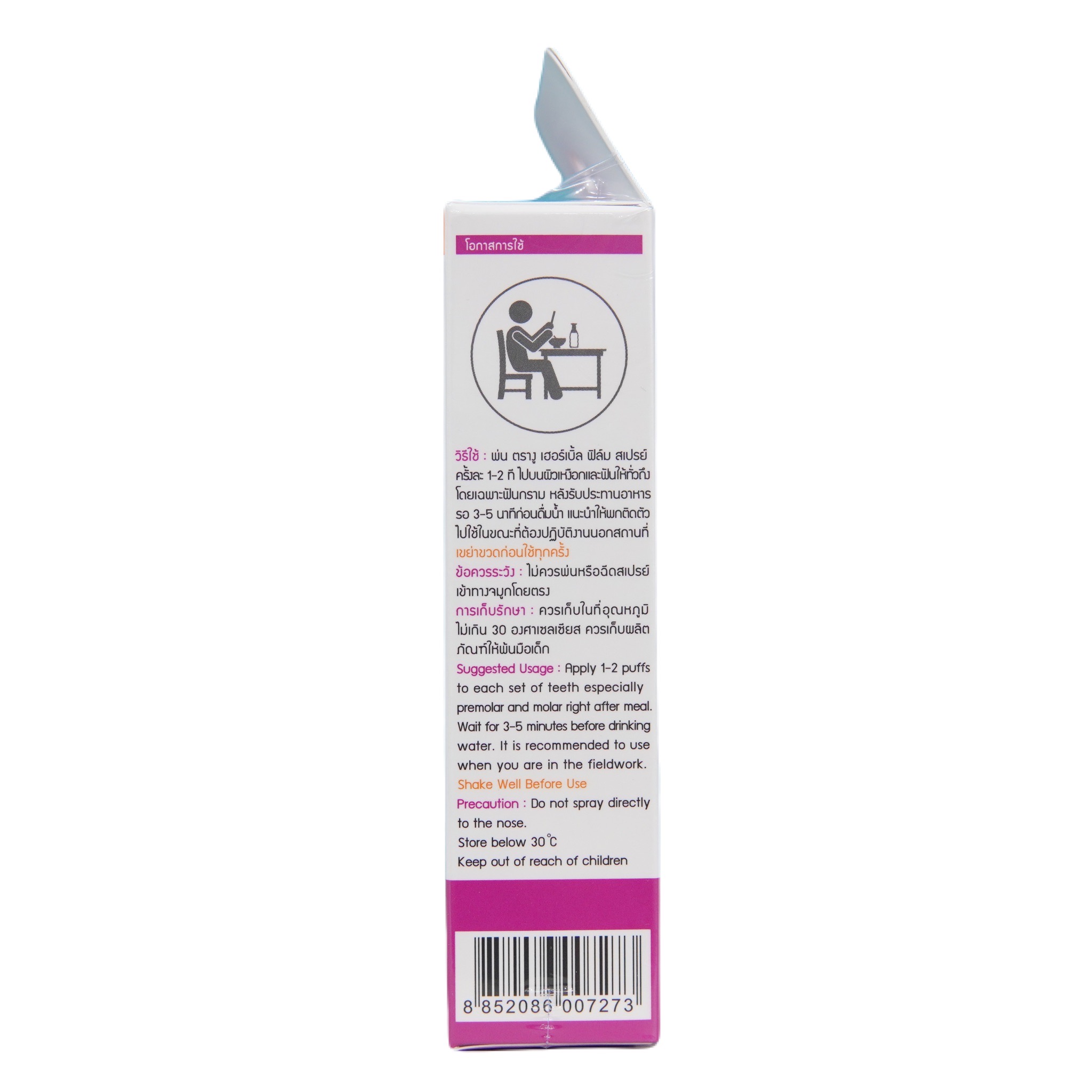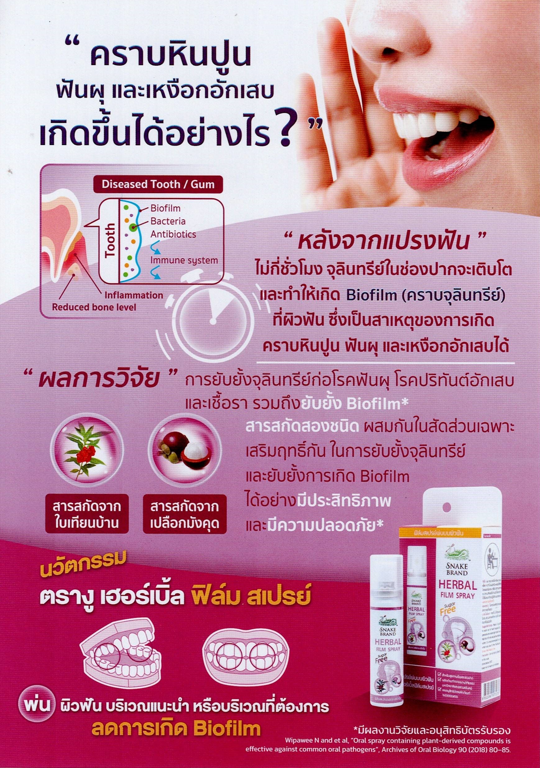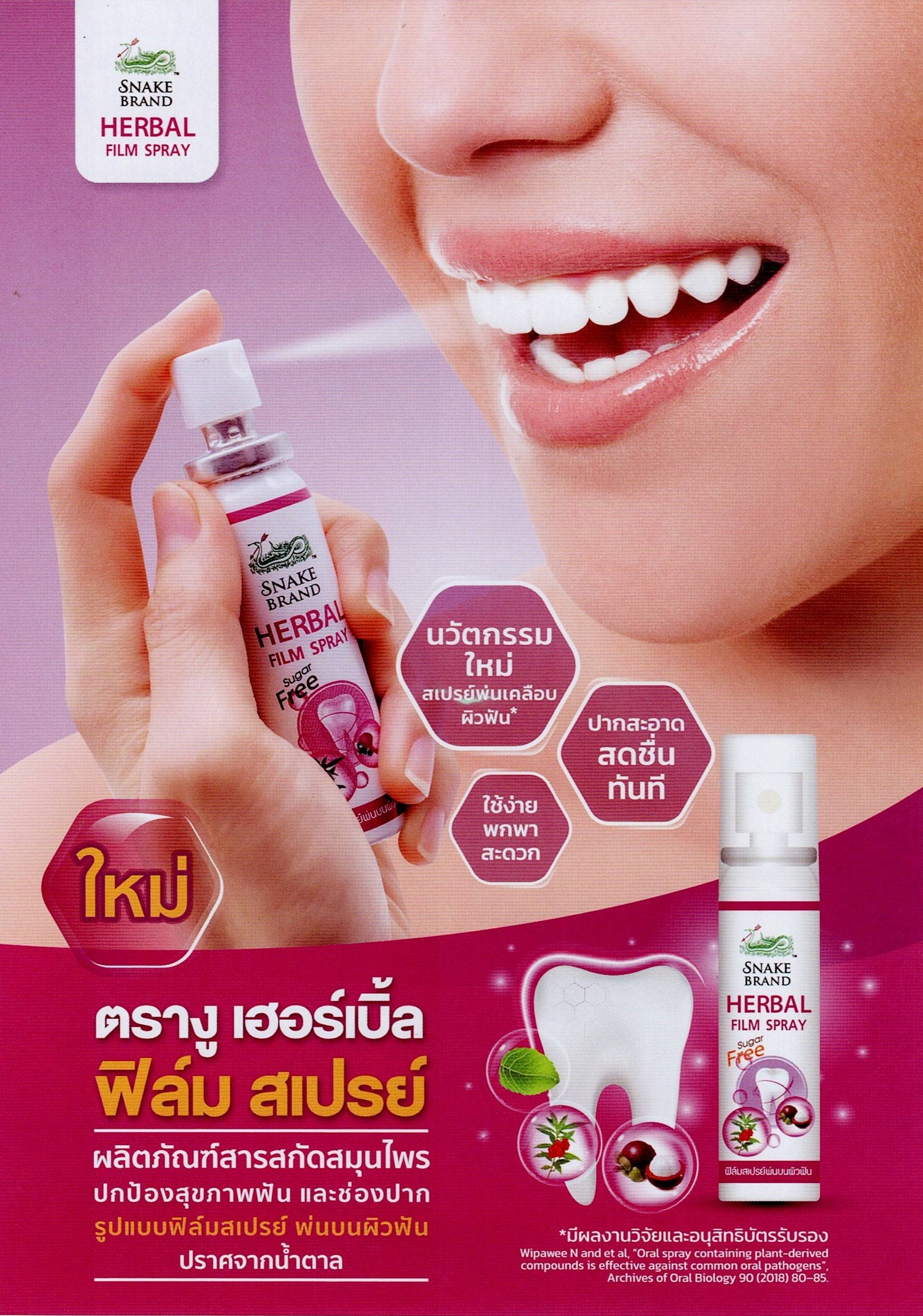 วิธีใช้: พ่นฟัน 1-2 ทีไปบนิวเหงือกและฟันให้ทั่วถึง โดยเฉพาะฟันกราม