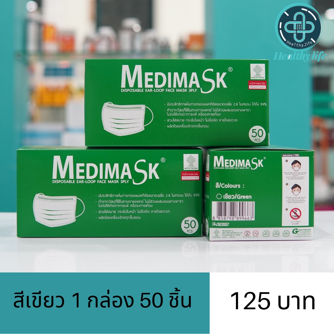 หน้ากากอนามัย MEDIMASK กล่องละ 50 ชิ้น (MEDIMASK diposable medical face mask 50 pcs./box) หน้ากากอนามัยใช้แล้วทิ้ง เกรดทางการแพทย์ สถานที่ผลิต: ประเทศไทย , Thailand